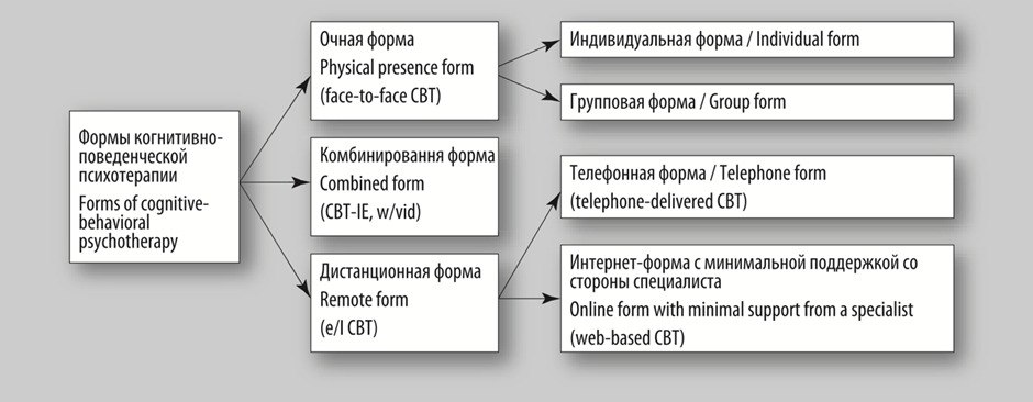 Согласно А.И. Мелёхину, проведение психологической коррекции методами КПТ возможно с помощью различных платформ видеозвонков (Skype, WhatsApp, Google Meet, FaceTime, Zoom). Выбор платформы зависит от различных факторов, включая опыт, доступность, предпочтения клиента и специалиста. Платформы Skype и Zoom имеют функцию общего доступа к экрану, опцию «белая доска», где можно более эффективно проводить психодиагностику клиента или разъяснять какие-то теоретические аспекты консультирования. Рекомендовано проводить онлайн-сессии примерно с той же продолжительностью, что и очные (45–60 минут).